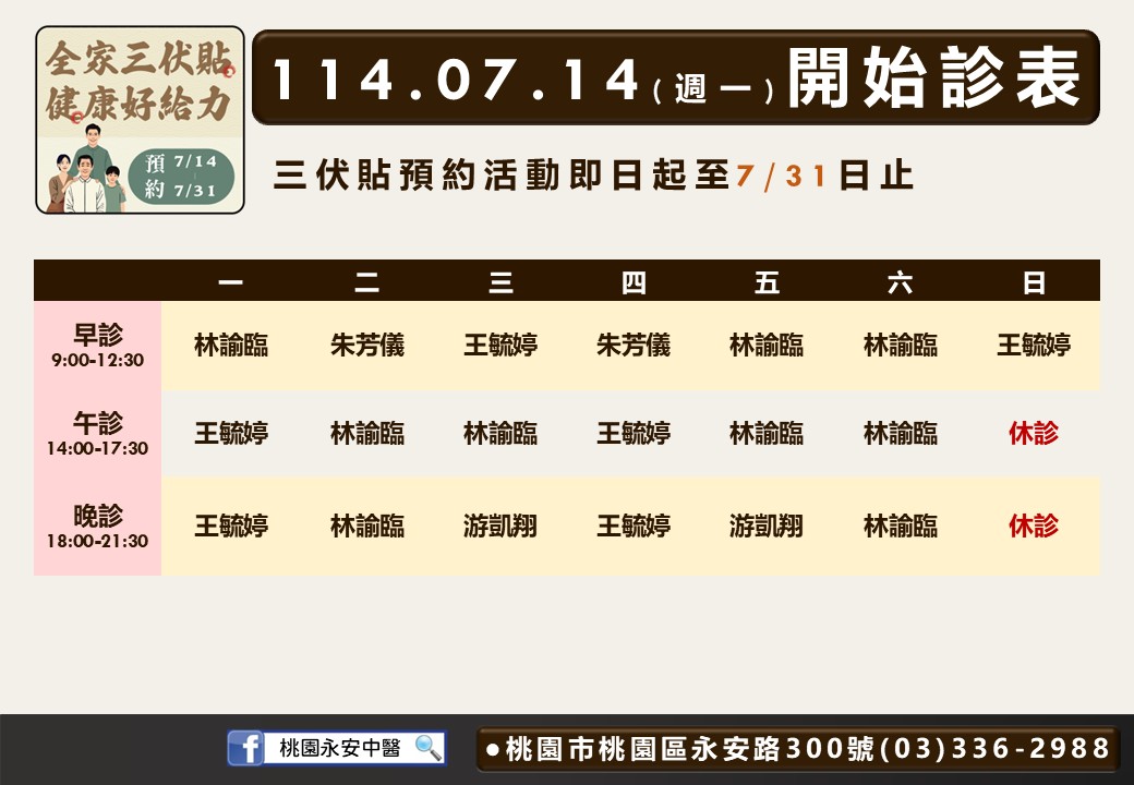 三伏貼預約活動起日期至7/31日止|114年7月診表